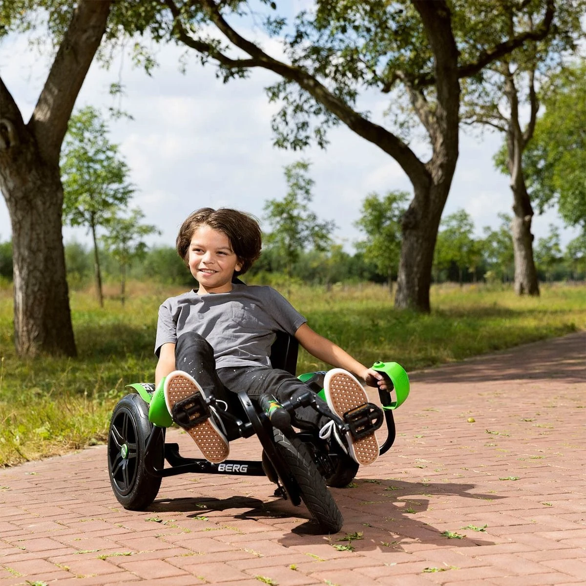 Wil je echt iets anders en stoers qua skelters? Kies dan voor de BERG Street-X Venom voor de vetste moves. Dit groene scheurmonster stuur je door met je lichaam te bewegen zonder balans te verliezen. Dit is geïnspireerd op het meebewegen in de bochten bij motoren en race-auto’s. Daarnaast heeft de BERG Street-X luchtbanden waardoor je extra comfortabel rijdt. Door het BFR-systeem kun je met de pedalen remmen, maar ook direct na stilstand achteruit rijden. Geef je kind iets speciaals met deze unieke skelter.